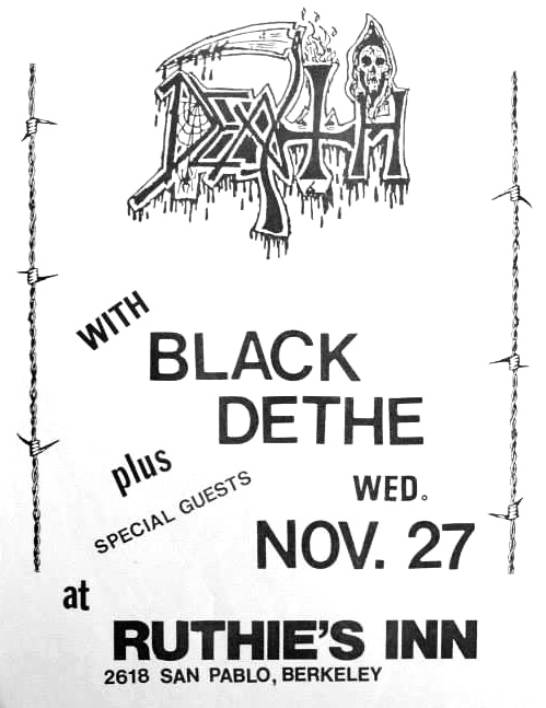 Erik -I wasn’t really that familiar with the East bay metal scene since I was part of the punk scene in SF, and was only occasionally crossing paths with metal bands. But the first time we played Ruthie’s I was really surprised by how excited the kids there were to see us. You see, I had never heard of Death before Eric Brecht asked me if I’d want to play bass in the band. I thought they were just a band with a few home made cassette tapes out, which in punk circles meant you were just locally known. Death were from Florida so I figured nobody in the bay area had heard of them/us. I didn’t realize that within the metal scene tape trading homemade cassettes was a big deal, and true fans took it seriously. So at our first show there were actually people with our band logo painted on the back of their leather jackets who were all jacked up to see us. I also remember that the opening act at our first show was an Oakland band called Black Death who sounded an awful lot like us, and were really excited to be on the bill. It was an nice surprise for me. I think we either played with Sacrilege BC, or at least they were at the shows because I became friends with those guys thru Death, and later on when Dave Edwardson (of Sacrilege and Violent Coercion) started Neurosis. He and Scott Kelly asked me to be part of it. I lasted about two rehearsals before I guess they decided I wasn’t on the same page with them musically, and stopped calling me about rehearsals. When I finally called Scott he said “Oh, we decided we just want to be a three piece”, so I said, "Ok, well then, I’m gonna come over and pick up my amp”, to which Scott said “Oh, that’s another thing... we accidentally blew up your amp the other night”. Only last year Scott commented to me on Facebook, “By the way, I still haven’t forgotten that I owe you an amp. But you will always be OG Neurosis”. I thought that was nice. but back to your question. No, I didn’t see any backstabbing or catty behavior ever, in fact one of the guitarists from Testament loaned Chuck a Marshall Stack for one of our Ruthie’s shows, because at that time all Chuck had was a Peavey Transistor amp.